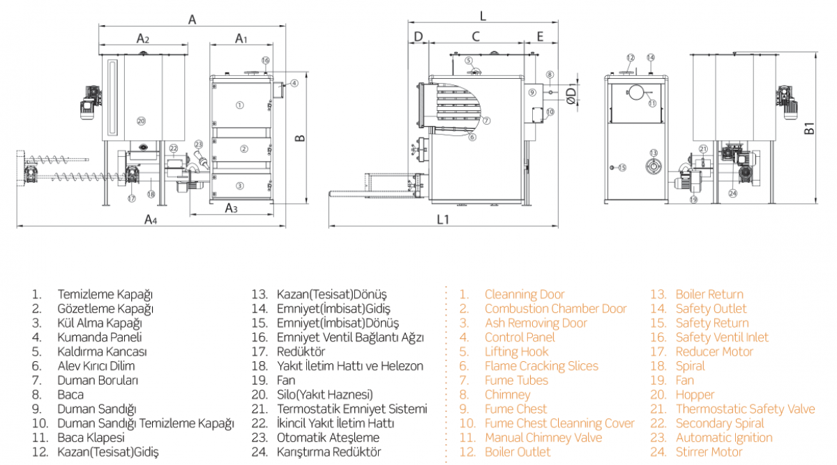 | TASARIM | 3 geçişli alev kırıcı dilim & duman borulu sistem, |