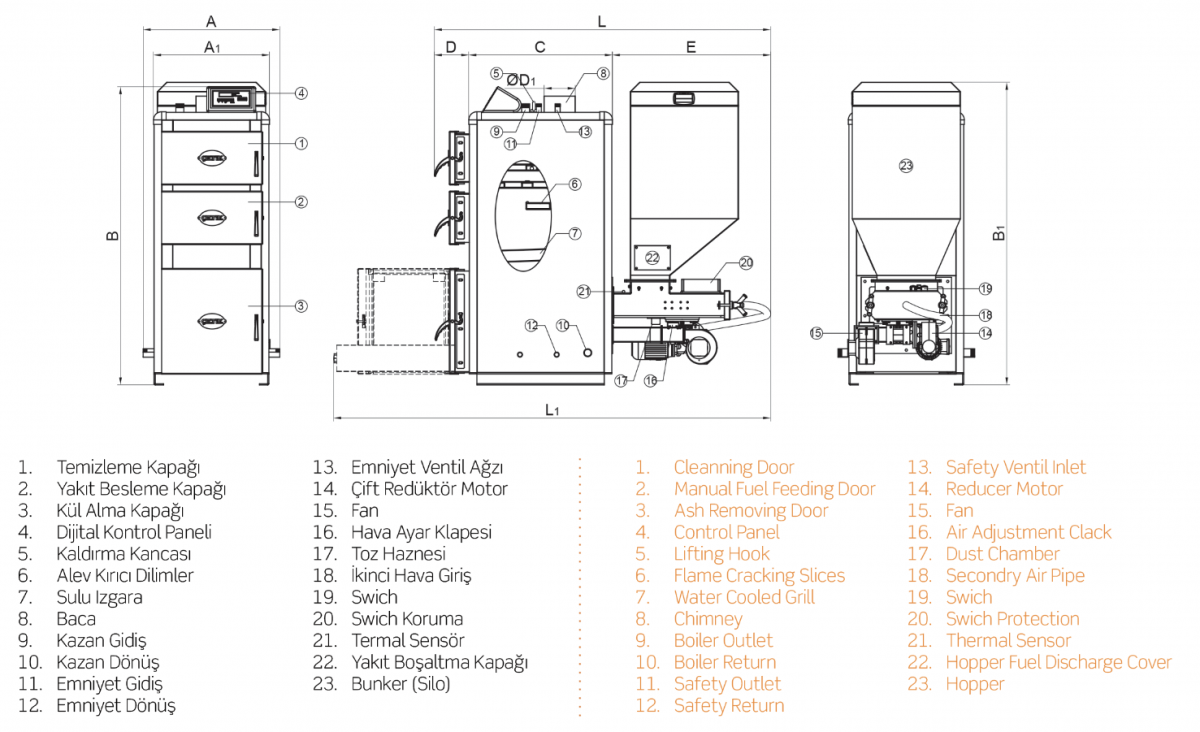 | Portakal kömür, odun, alternatif parça yakıt ile manuel kullanım, | |